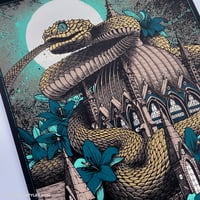 Official Mastodon gig poster produced for the band's November 18, 2021 show at the Wang Theatre at the Boch Center in Boston, MA. Edition of 155, individually hand-numbered and embossed. Screenprinted by Lady Lazarus in 6 colors (including metallic gold) onto 100# natural cover stock. Measures 18x24" and signed by the artist. Ships rolled in a heavy duty tube and insured.